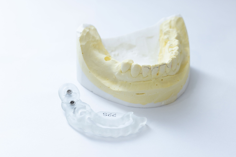 インプラント手術用のマウスピース型装置です。埋入する角度、深度、位置のズレをなくす手助けをします。
