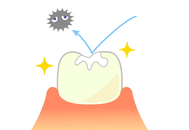 乳歯や生えたばかりの永久歯は、歯の表面の「エナメル質」が薄いことが特徴です。そのため、虫歯に感染するリスクが高くなっています。そこで有効なのがフッ素塗布です。フッ素は歯質を強くしたり、細菌の繁殖を抑えたりするなどのメリットがあります。